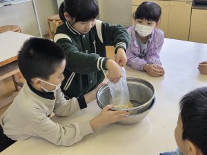 3年生は、総合的な学習の時間に、湖南校区にある関商店さんにお世話になり、豆腐づくりに挑戦しま