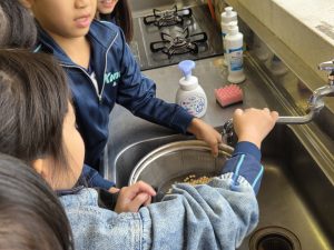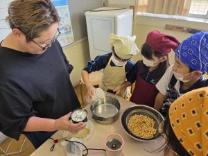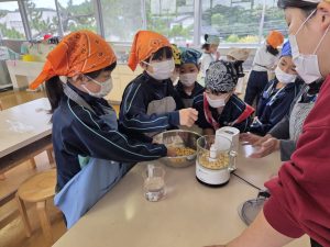 国語科「すがたをかえる大豆」でも学習した3年生は、大豆をミキサーにかけ、ゆっくりと鍋で煮た