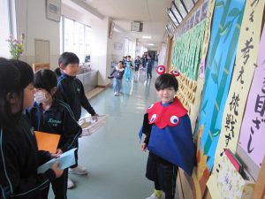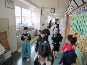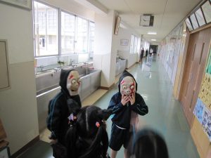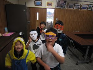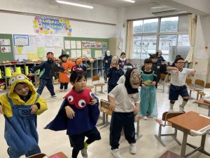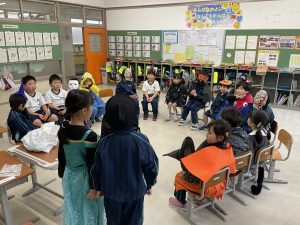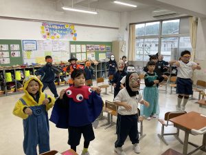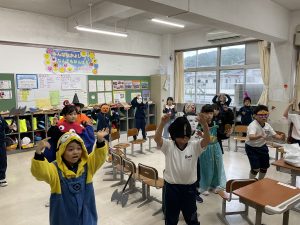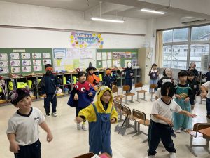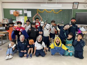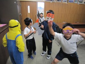 ハロウィンを楽しむ!(1年生) ★ 10月31日(金) 2025年10月31日 お知らせ, 思い出レポート 1年生は、ハロウィンパーティーをして楽しみました。 一人一人仮装して、ハロウィンダンスや宝探し、フルーツバスケットをしました。 校長室にも、仮装した姿を見せにきてくれました。