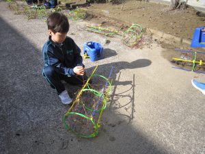 晴天の今日、1年生は毎日水やりをして育てたアサガオの後始末をしました。