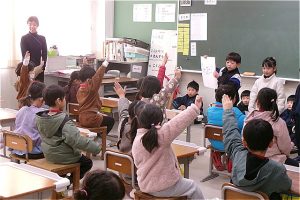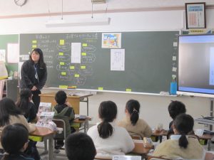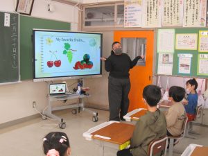 1年生は、ALTのジェアヌ先生と外国語の勉強をしました。