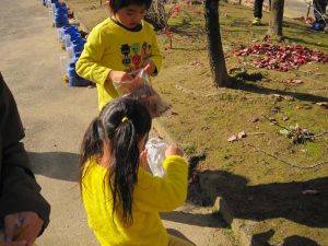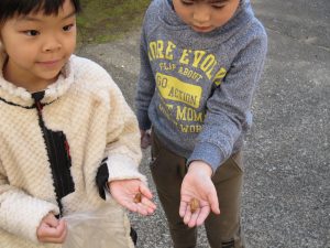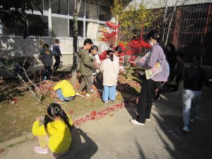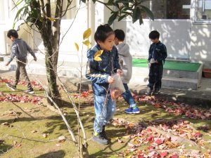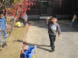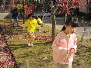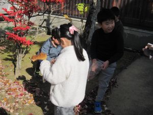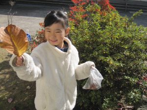 散っていく落ち葉を集めたり、ドングリやセミの抜け殻を拾ったりと、たくさんの秋を見付