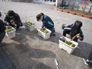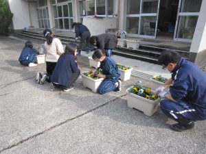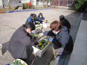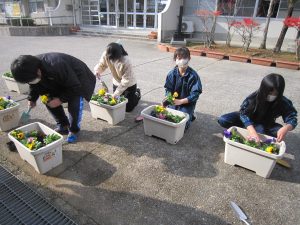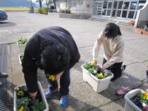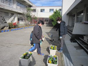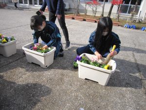 今日の昼休みに、5年生の環境委員で、プランターにパンジーを植え付けてくれました。