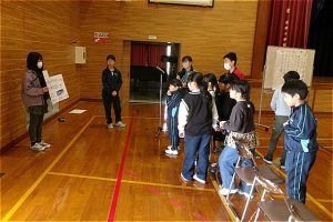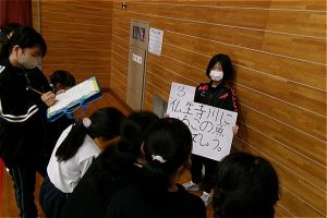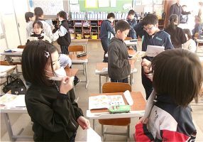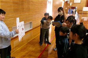 縦割り班のメンバーで校内ウォークラリーをし、環境委員が考えた正しい掃除の仕方や植物等のクイ
