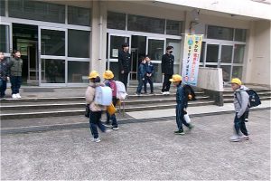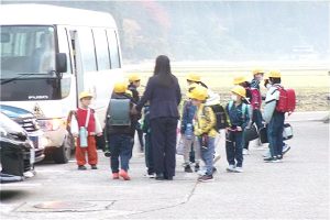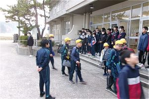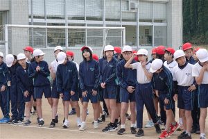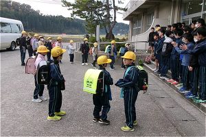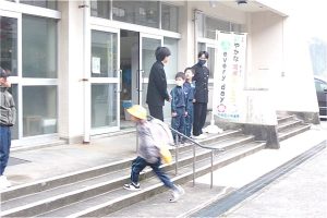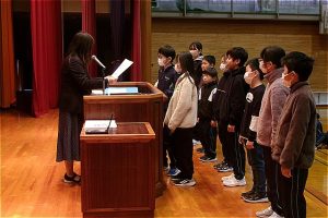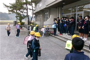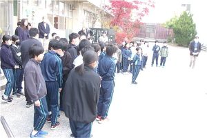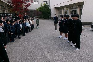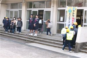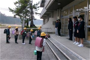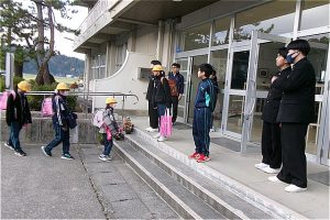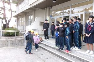 中学校生徒会のお兄さん、お姉さんたちと一緒に、全校児童が集まってきて、元気な挨拶で朝を迎える
