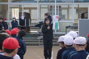 湖南小学校の児童会のメンバーだけでなく、「元気な挨拶を広げよう」とたくさんの児童が参加しました。