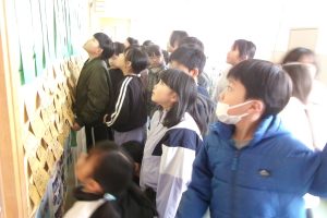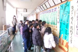 校長室前の竹に書いた「なりたい自分」を振り返りにくる2年生です。