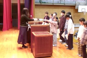 原木シイタケ栽培でお世話になっている仏生寺の六田さんが来校され、4年生の児童に原木シイタケを手渡してくださいました。