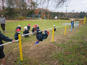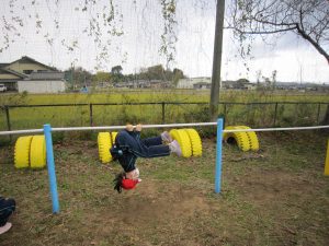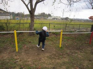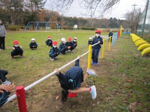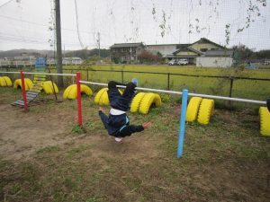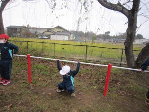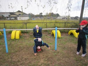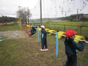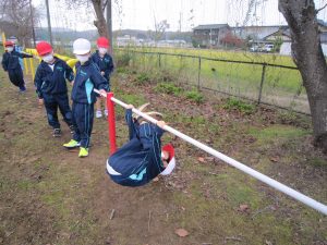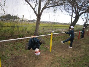 1年生は、鉄棒あそびに取り組み、できるようになった技を発表していました。