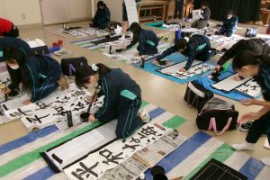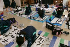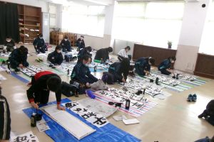 1回目は「四文字をバランスよく紙に収めること」、2回目は「へんとつくり等、文字の中心に気を付け、字形を整えること」を目当てに練習しました。3回目の今日は、それらに加えて「線の太さに着目して、力を入れること」を目当てに練習しました。