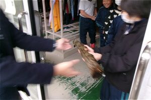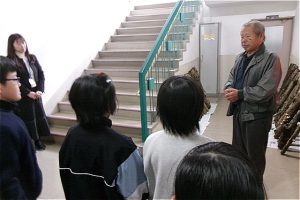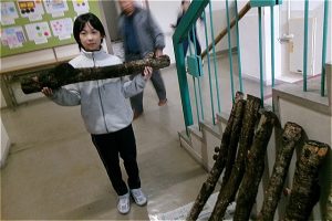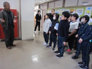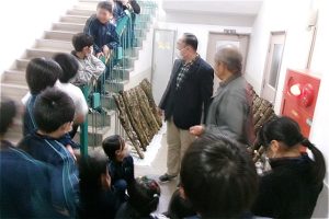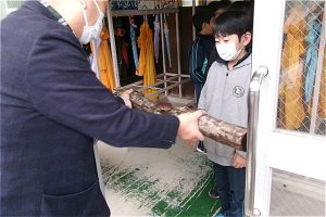 原木シイタケ栽培でお世話になっている仏生寺の六田さんが来校され、4年生の児童に原木シイタケを手渡してくださいました。