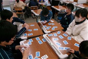 けん玉、フルーツバスケット、トランプ、ドッジビー、かるた等、各部屋に分かれ、縦割り班で楽しみ