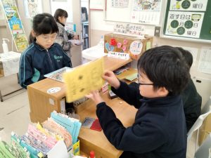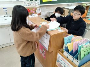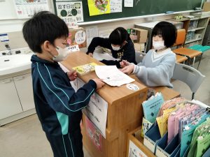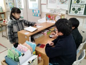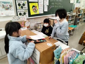 休み時間には、4年生の図書委員が図書室に本を借りにきた1、2年生に本を貸し出しました。