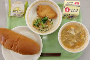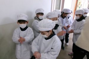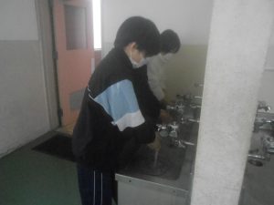学校の感染症対策の1つとして、給食前に石けんを使った手洗いとアルコール消毒を励行しています。