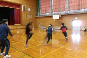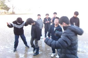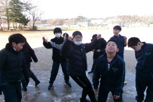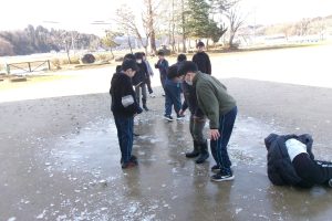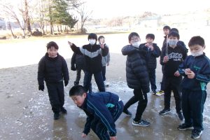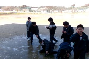 中休みになると、4、5年生は真っ先にグラウンドへ走って行き、氷の上へ。