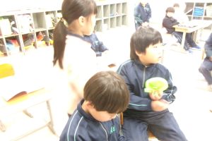 1年生は、算数科「なんじ なんぷん」の学習をしていました。「2時17分」に、長い針と短い針を合わせ、友達同士で見せ合っていました。時計を見て行動できるようになりますね。