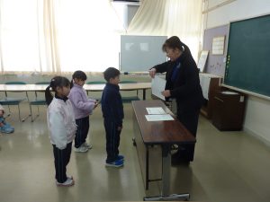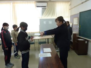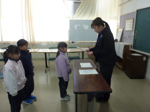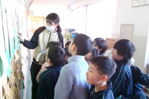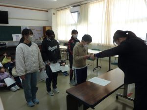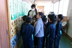 1年生は、校長室前に掲示してある、一人一人の「なりたい自分」カードを振り返り、先生に金と銀のシールを貼ってもらいました。これからも、目当てをもってがんばってくださいね。