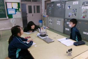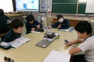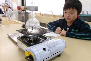 今日は、グループごとに、丸底フラスコに水を入れ沸騰させる実験に取り組みました。