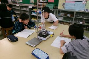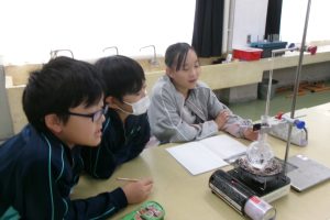 「上も、すごいゆげが出てきたよ。」「先生、フラスコの水が少し減ってます!」