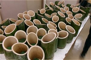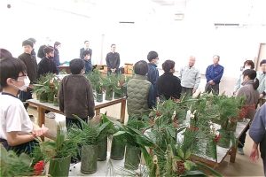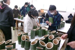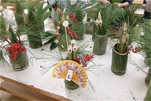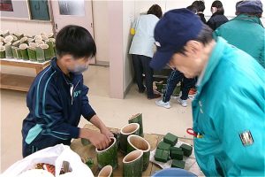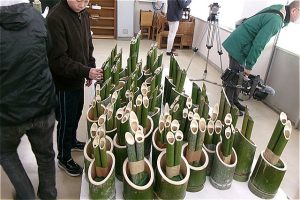 フォレストリーダー、ひみ竹林ネットワークのみなさんに飾り付けの仕方を教わりながら、もくもくと