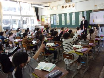 友達の発表に賛成か、付け加えるか、指の形で意思表示します。