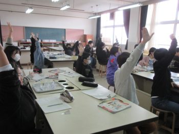 近くの友達と笑顔で話したり、教科書を読んだりしていました。