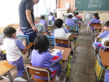 教室の約束を守りながら、友達と仲よく楽しそうにタブレットを使っていました。