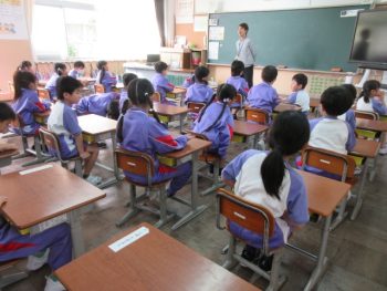 先生の話を聞くときは、机の上に何もないようにしてから話を聞きます。