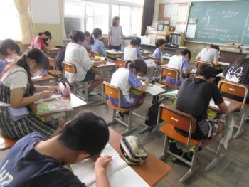 先生が、丁寧に書けている子供など、がんばりを認めながら回ります。