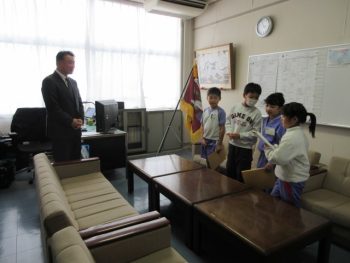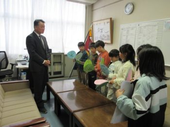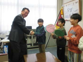 今日は、子供たちがつくったねぎを売る会社の営業部の子供たちが校長室にきました。