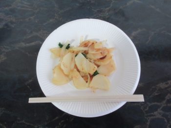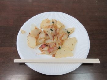 ゆでたじゃがいもとタマネギ、ベーコンを入れて炒めました。