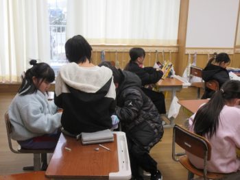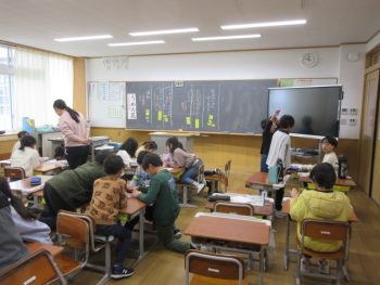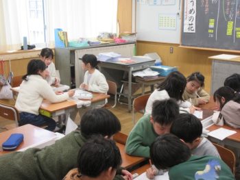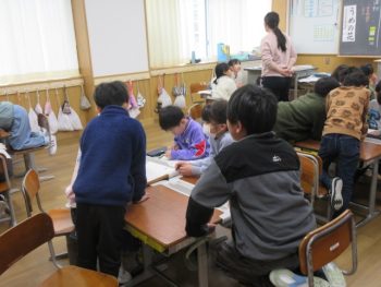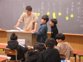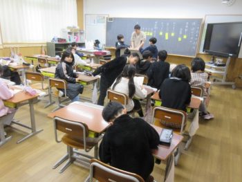友達と一緒に考える子供や、考えた目当てを宣誓に確かめてもらう子供がいました。