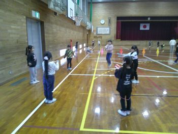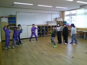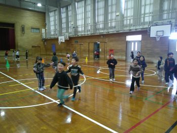 体育館で縄跳びをして、仲よく遊んでいました。