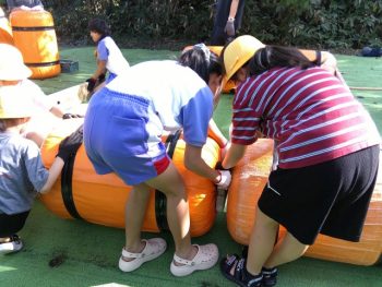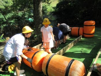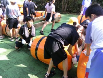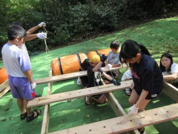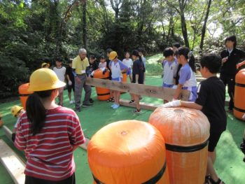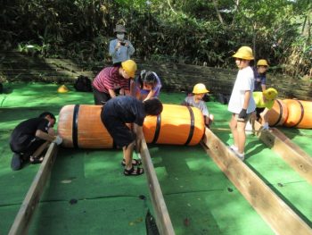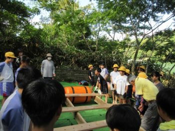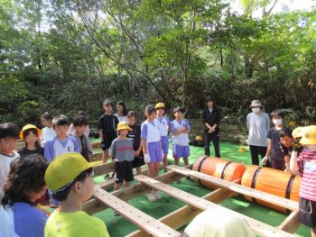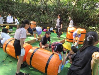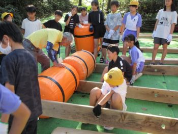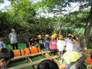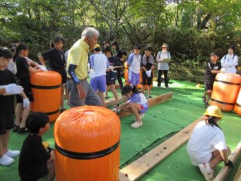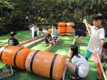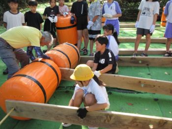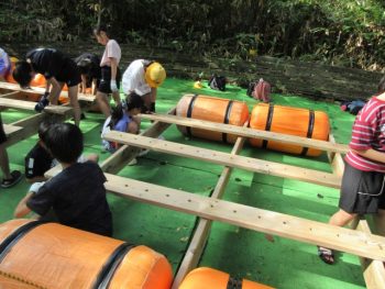 浮きや、竹の棒、板を組み合わせていかだを作りました。