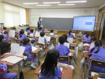 漢字の練習をする前に、先生が字を書くときに気を付けるポイントを指摘しました。