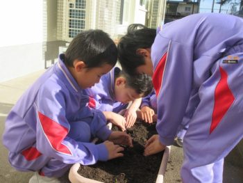 先生があけた穴に球根を入れて、そうっとそうっと土を優しくかぶせました。