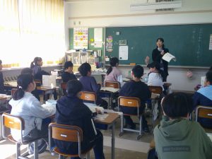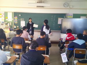 6年生の宮田ハマナス会社は、商品開発、商品販売を頑張っています。今日は、商品を委託販売させてもらうために、39フルーツさんを訪れました。商品を販売するための工夫や陳列の仕方等を学びました。これからは、協力していただく店舗を増やして、販売していきます。