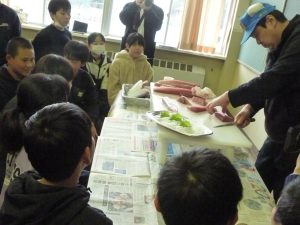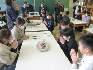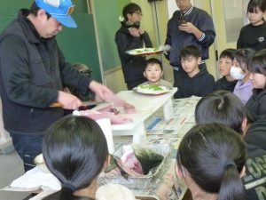 今日は、6年生が「氷見の魚を知ろう事業」に参加しました。大きなぶりを目の前で、さばく様子をしっかりと見せていただきました。包丁を上手に使って、切り身になり、お刺身に仕上がりました。子供たちからは、大きな歓声が上がっていました。氷見のぶりはとてもおいしかったです。参加させていただき、ありがとうございました。