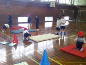 2年生は体育を頑張っています。今日は立ち幅跳びに挑戦していました。つまさきをそろえることや跳び終わった後にころばないこと等、気を付けることを話し合ってから、挑戦していました。頑張っていますね。