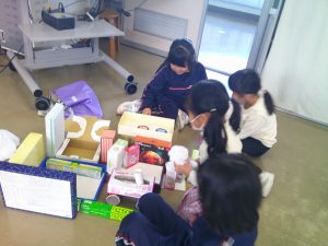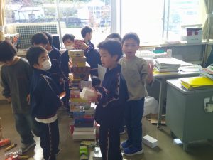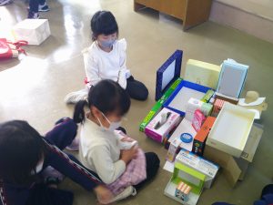 1年生は図画工作の学習を頑張っています。今日は、いろいろな箱を集めて、箱を使って町の様子、タワー等をつくっていました。グループになって協力しながら、どんどんつくっていました。出来上がりが楽しみですね。