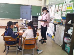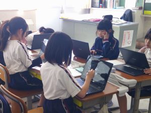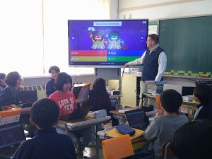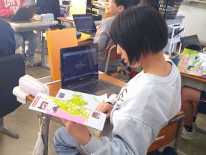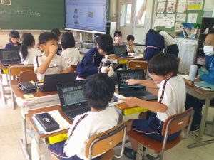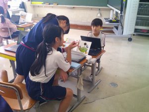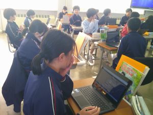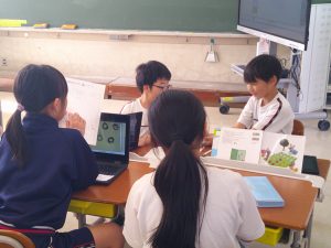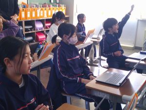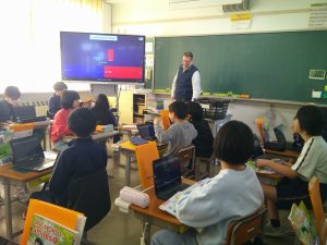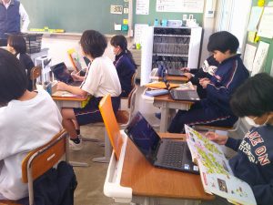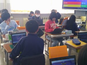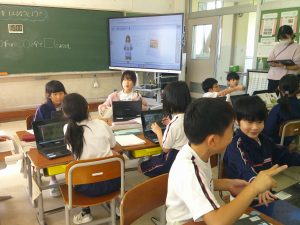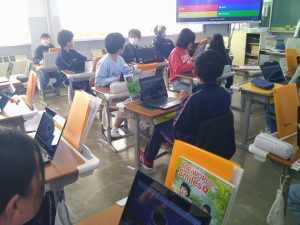 5年生は外国語を頑張っています。今日は、いろいろな都道府県の英語のクイズでした。「英語で、なまはげ、味噌カツ、トビウオ…」と言えば…。みんなタブレットを使って、一生懸命に答えていました。ためになりますね。