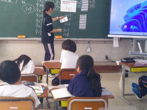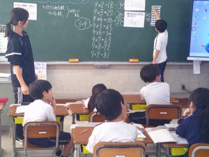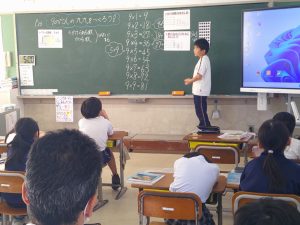 2年生は算数を頑張っています。今日は九九の九の段です。だんだん数が多くなってきましたね。考え方を一生懸命話し合っていました。