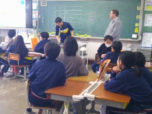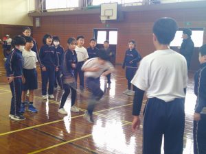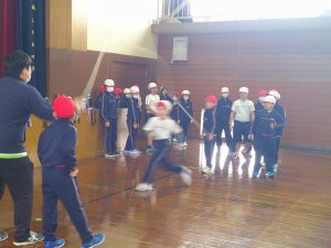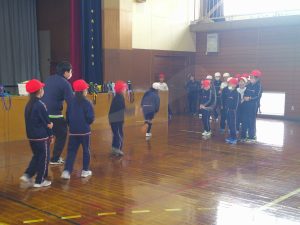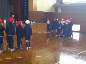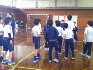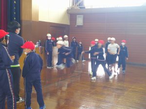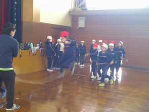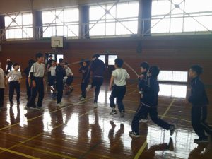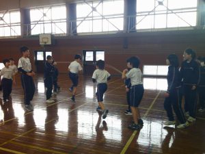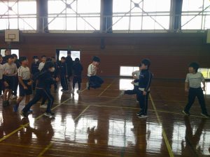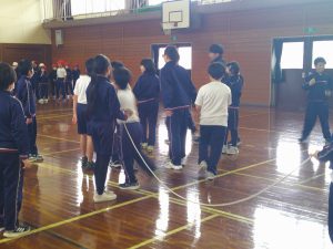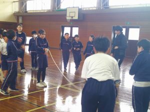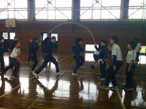 4年生は体育科の学習を頑張っています。今日は八の字跳びに挑戦です。4年生は、回し手も自分たちで頑張ります。縄を回すタイミング、次々に跳ぶタイミングも難しいですね。みんなで声を掛け合って、頑張っていました。