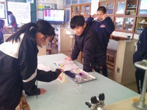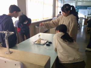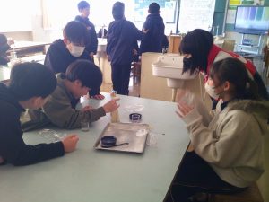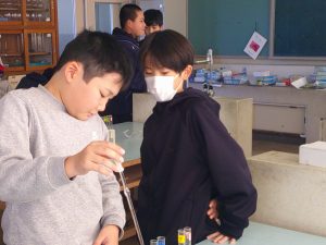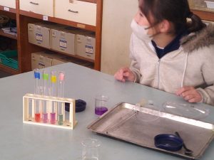 6年生は理科の学習を頑張っています。今日は、紫キャベツを使って、中性、酸性、アルカリ性を学んでいました。食塩、塩酸等を混ぜてみると、色の変化が分かりやすいですね。
