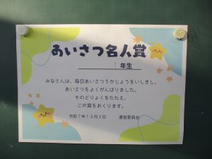 12/19 運営委員会 2025年12月19日 その他, 活動の様子, 学校からのお知らせ 今日は運営委員会の企画した「あいさつ名人賞」の授賞がありました。いつも元気に挨拶をしている友達に贈られます。3学期も元気に挨拶をしましょう。
