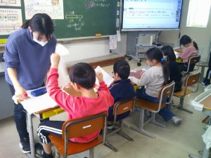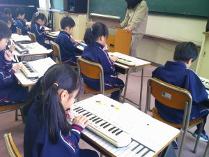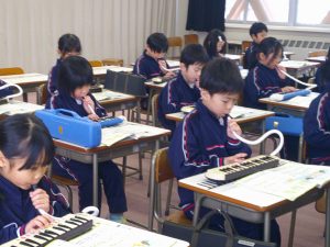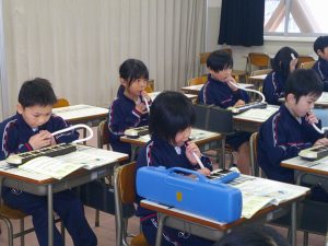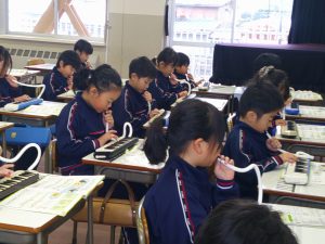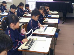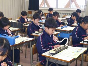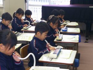1年生は音楽の学習を頑張っています。今日は、「こいぬのマーチ」を鍵盤ハーモニカで練習していました。指の使い方に気を付けて、一生懸命練習していました。上手になりましたね。