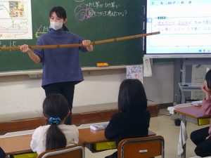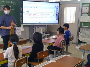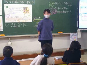 2年生はさんすうかの学習を頑張っています。今日は、長さや計算の学習に取り組んでいました。グループに分かれて、1メートルものさしを使って、3メートルのものを探していました。長さの感覚が身に付いてきましたね。