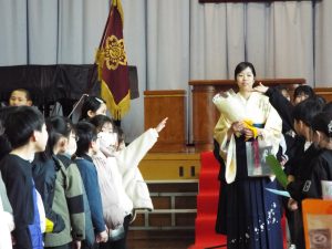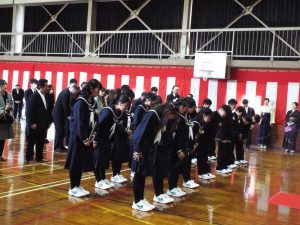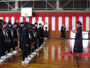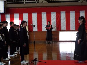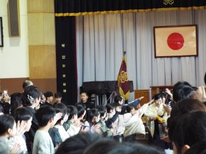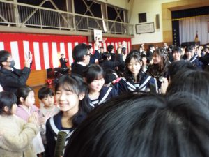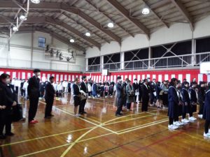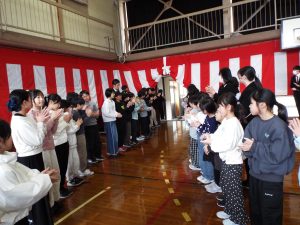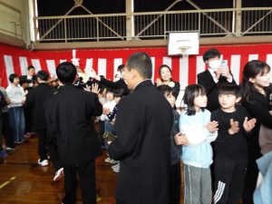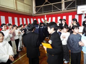 卒業証書授与式の後は、歓送の集いです。みんなで卒業生を見送りました。天気は雨模様で、体育館で行いました。