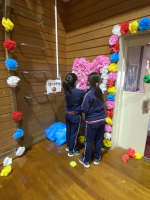 5年生が計画、運営した「卒業を祝う会」が行われました。体育館飾り付けも5年生が工夫を凝らしたものになっており、壁面には4年生が描いた6年生の似顔絵が飾られました。