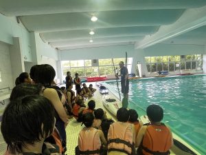 カヌーは、まずはプールで練習です。カヌーの操作は思った以上に難しかったです。救命胴衣を着けてカヌーの転覆体験にも挑戦しました。